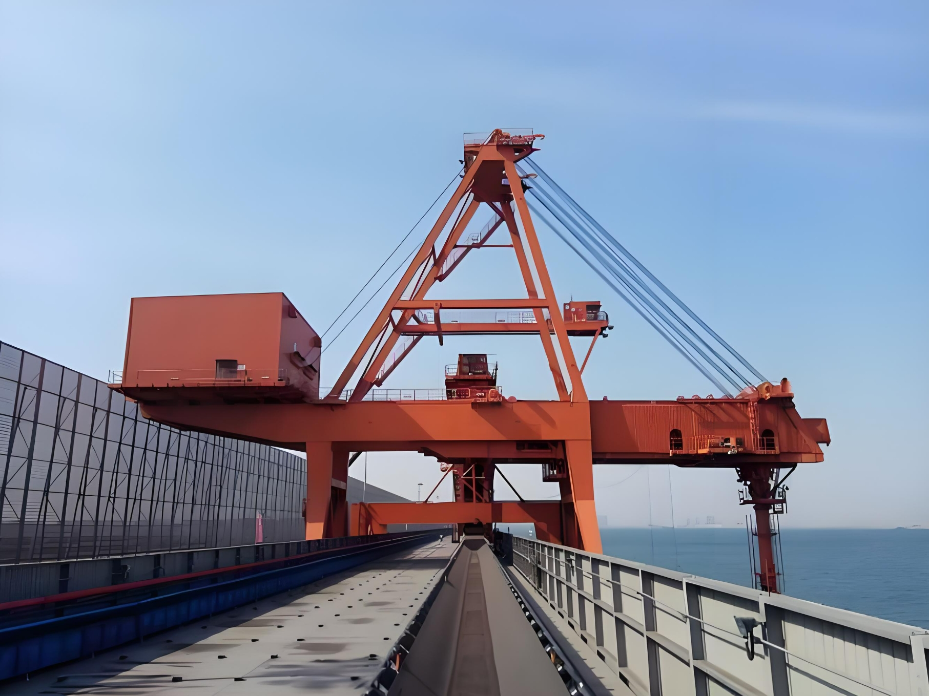 大型橋式抓斗卸船機是用來將固態(tài)散裝貨物從船艙運至碼頭上的煤料傳送帶上的大型設備。